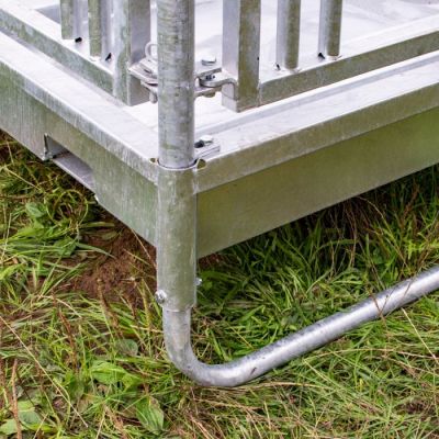 Ruokintahäkki pysyy tukevasti paikallaan kahden jalaskaaren avulla eikä se pääse vajoamaan märkäänkään maahan.